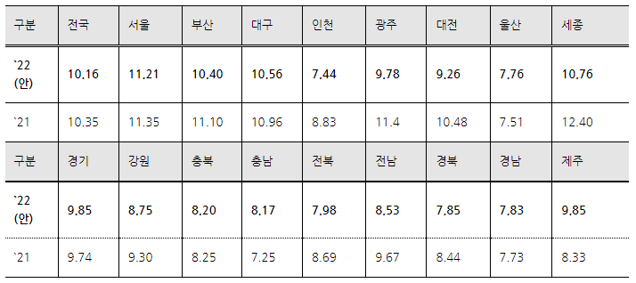 표준지 공시지가(안)은 감정평가사의 시세 조사를 토대로 「부동산 공시가격 현실화 계획(`20.11)」에 따른 현실화율을 감안하여 산정되었습니다. ‘22년 전국 표준지 공시지가(안) 변동률은 `21년 대비 감소한 10.16%로 조사되었습니다. 시‧도별로는 서울 11.21%, 세종 10.76%, 대구 10.56%, 부산 10.40% 순으로 상승률이 높으며, 대부분의 지역에서 작년 보다 변동률이 감소하였습니다.